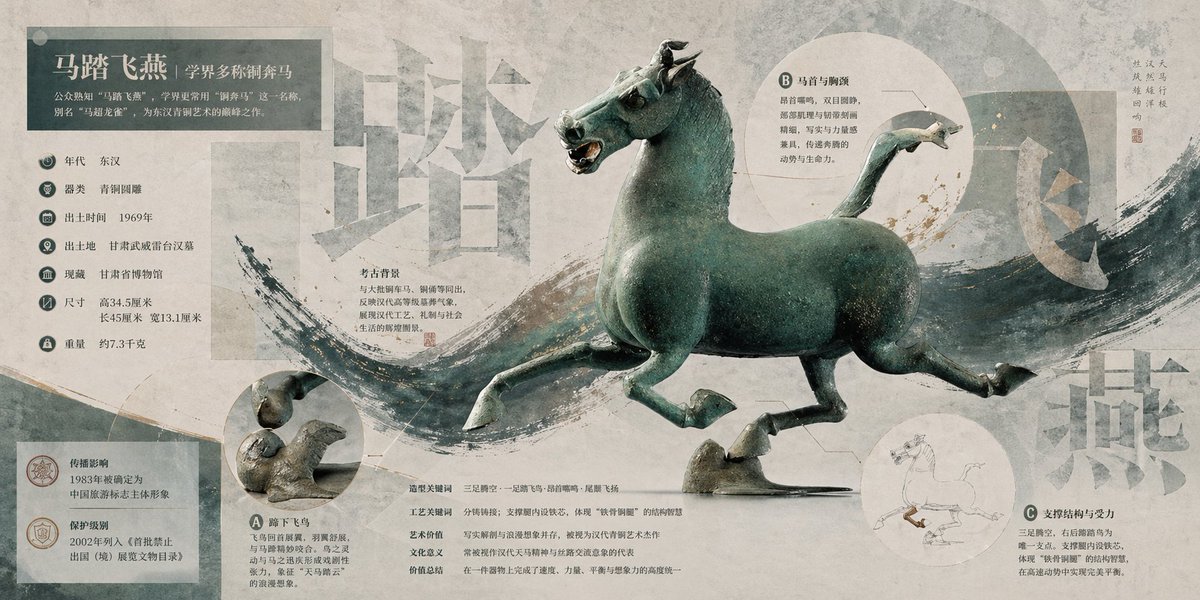 整体版式必须彻底摆脱教科书式、表格式、规则分栏式的信息图逻辑。画面要更有灵气、更有节奏、更有松弛感,更像国际知名海报设计师为一件文物量身打造的视觉作品。必须具备强烈的整体构图意识、前景与后景的穿插关系、几何图形的设计感、留白的控制力,以及图文之间的巧妙遮挡与共生关系。