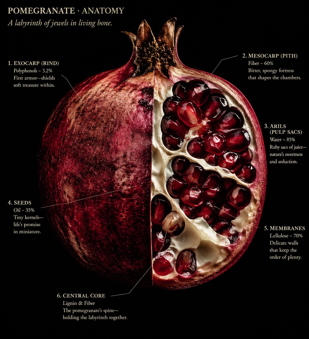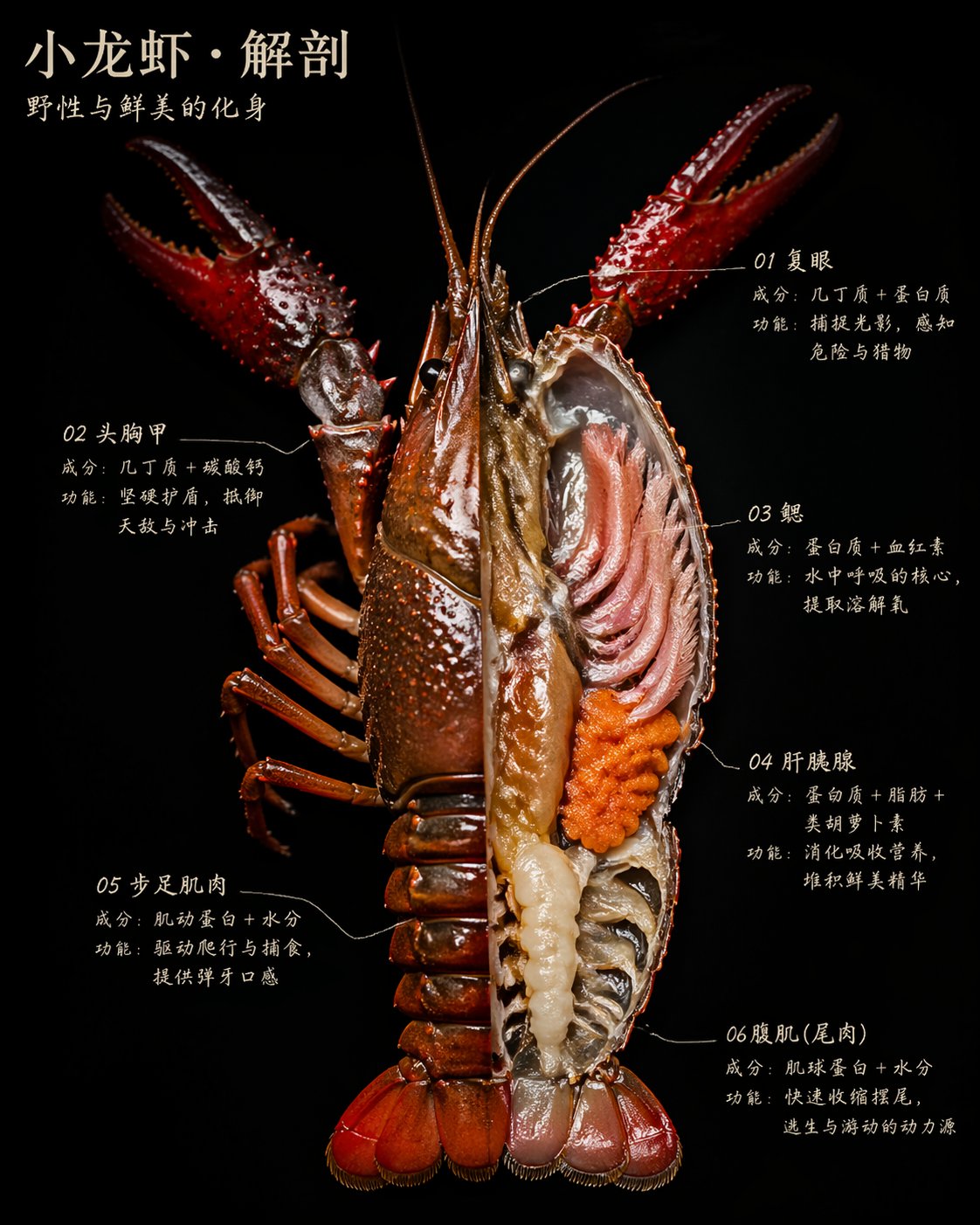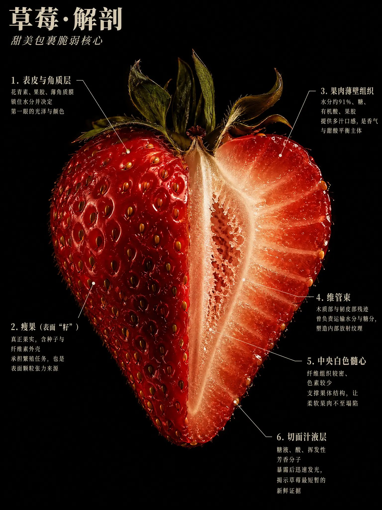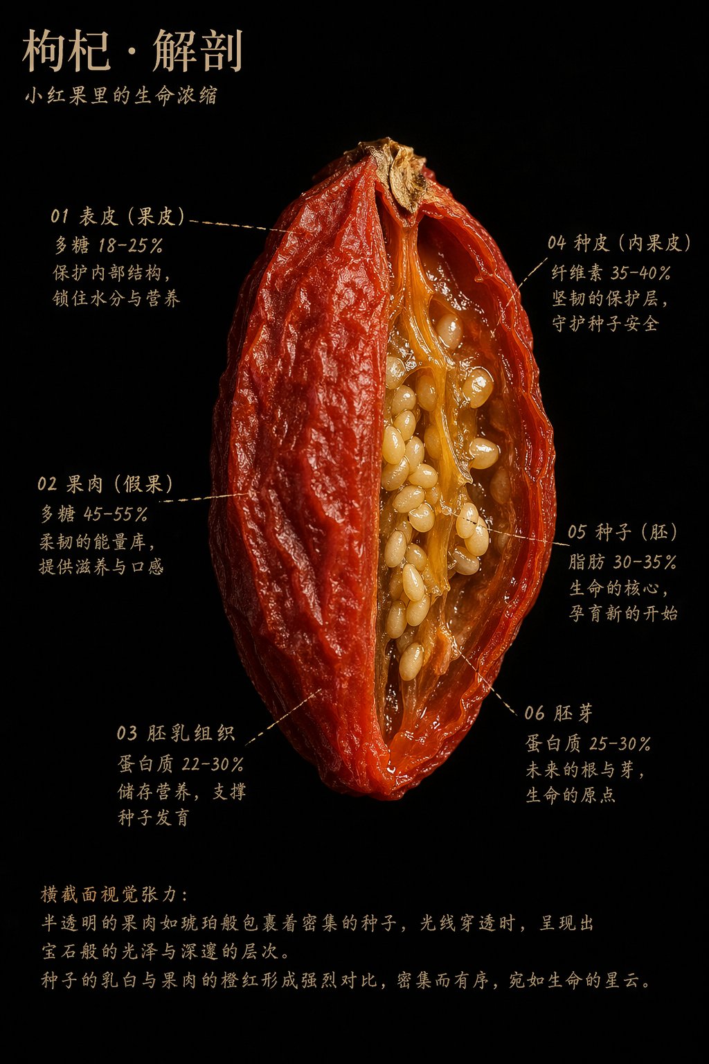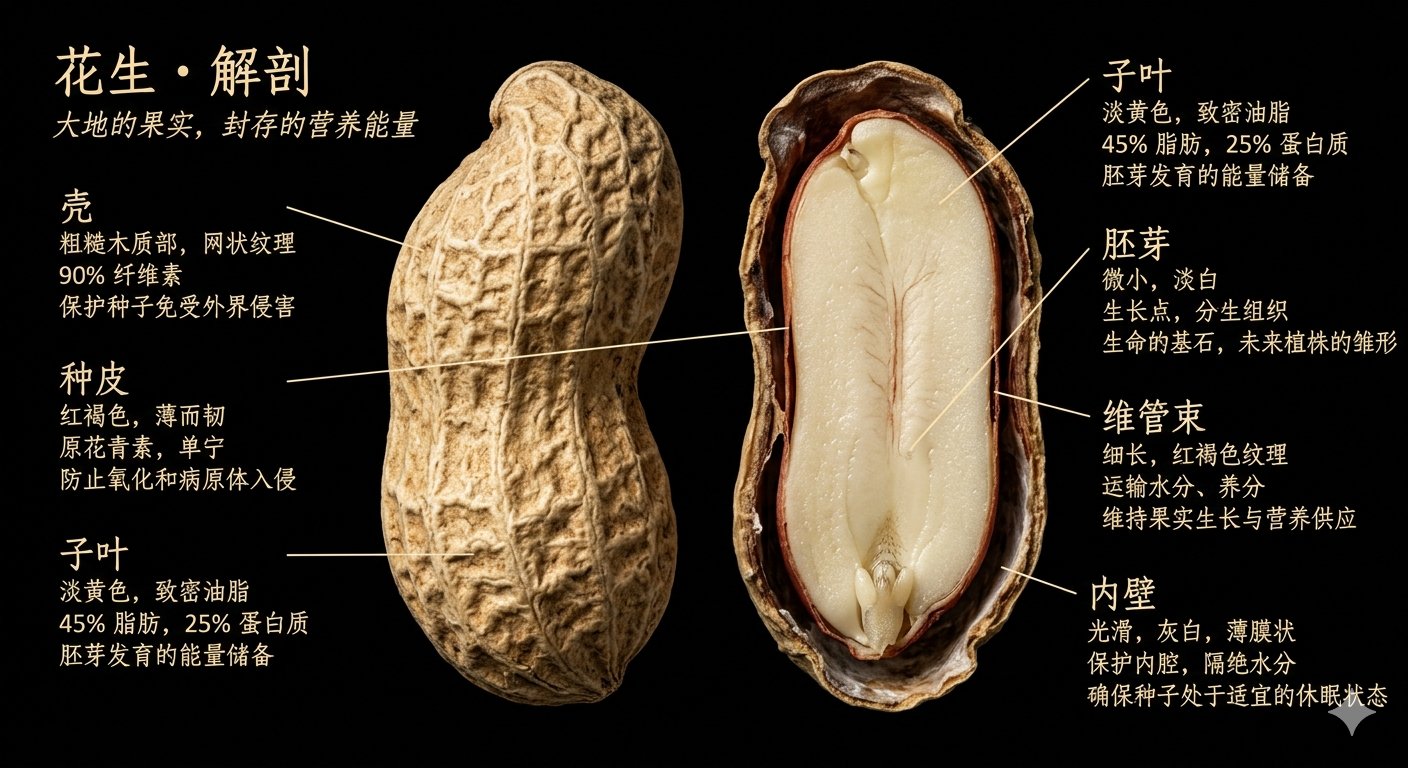 画面包含以下标注,每处标注三行:第一行结构名称,第二行成分数据,第三行一句人话: