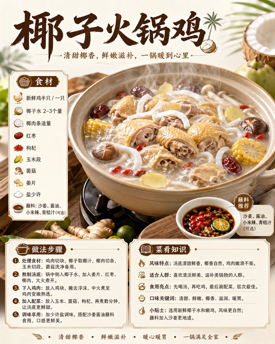 突出“刚出锅”的状态,鸡肉表面油润鲜亮但不过分油腻,椰香汤底带有轻微光泽,热气上升明显;画面要有强烈食欲感,像高端餐饮广告摄影与精致插画结合的效果。锅中食材层次丰富,近景特写清晰,令人一眼就想吃。避免画面杂乱,避免文字过多拥挤,保证信息丰富但排版高级。