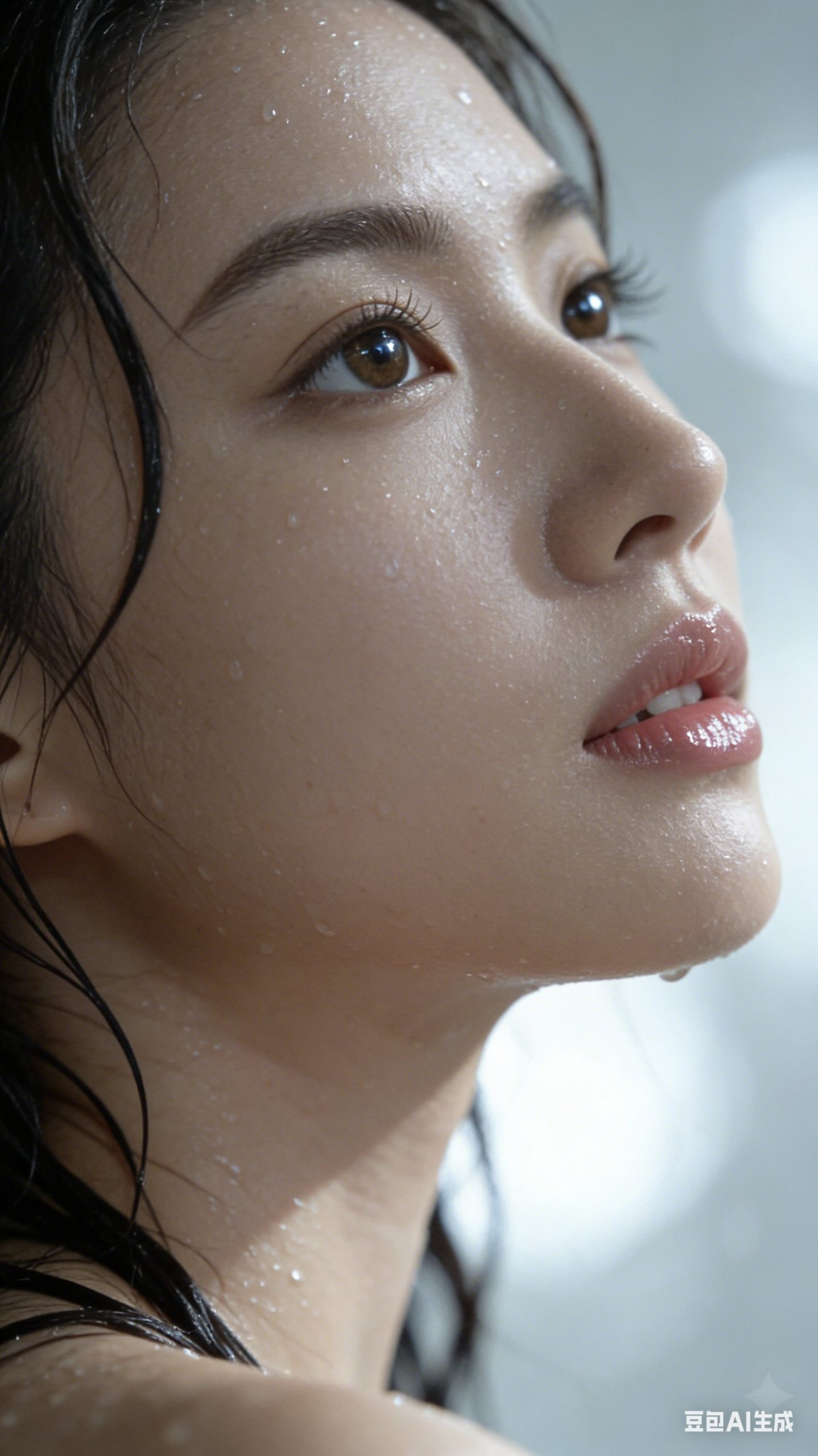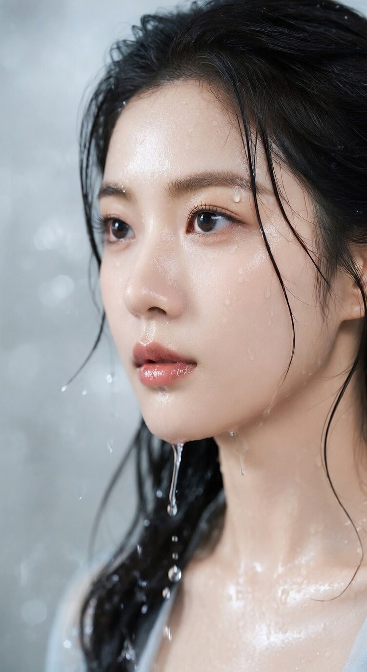 使用人物的面部特征不发生任何变化。“极致湿身特写肖像,年轻女子侧脸。深色湿发自然地贴在皮肤上。细小的水珠和汗珠在脸上闪闪发光,逼真自然。聚焦于明亮自然的眼睛,反射出真实的光影。水润闪亮的嘴唇,柔软自然的肌肤纹理。柔和的光线,冷色调,浅灰色和白色的散景背景。超写实,8K分辨率,电影级摄影,原始风格。” "负向提示词":避免出现 "过度出油、油性皮肤、干性皮肤、浓妆、卡通、插画、3D渲染、低质量、模糊、眼睛变形、人体结构错误、过度曝光、高对比度", “参数”: "宽高比": "9:16", 风格: 逼真