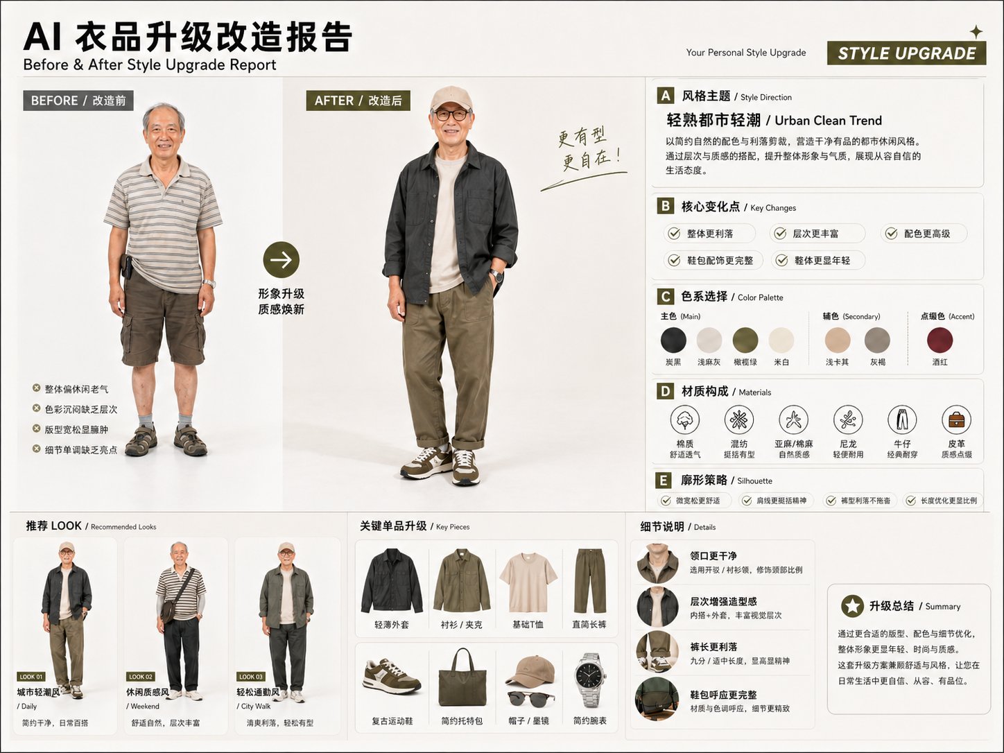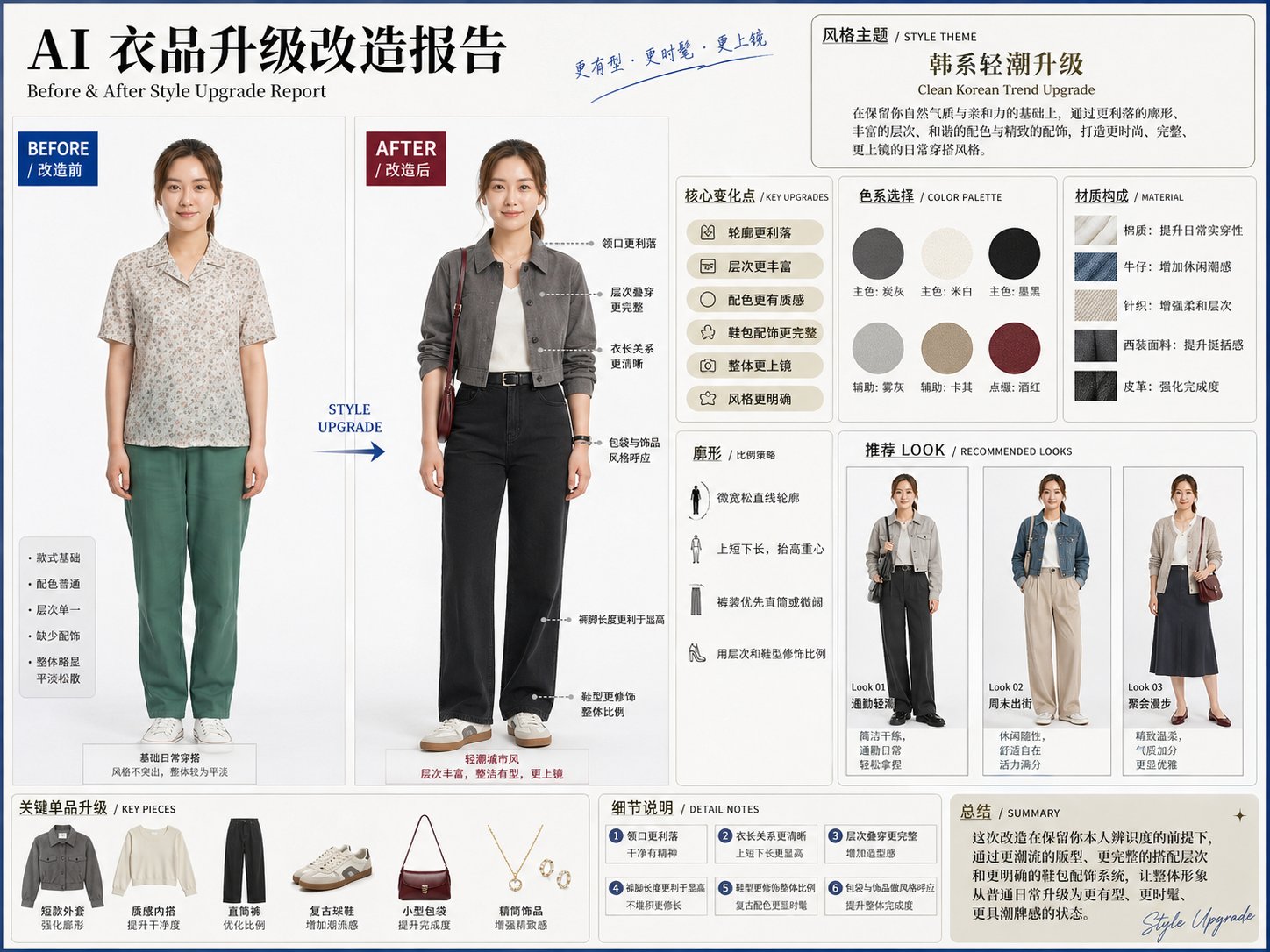最终输出一张横向 4:3 的「AI 衣品升级改造报告」。用户第一眼应感受到“改造后明显更帅、更潮、更会穿”,第二眼应感受到“这是一份专业、精致、有设计感、可执行的个人穿搭升级方案”。